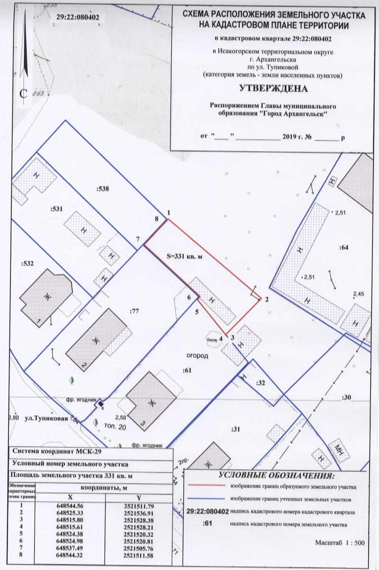 2.  Утвердить прилагаемую схему расположения земельного участка в кадастровом квартале 29:22:080402 площадью 331 кв.м, расположенного в Исакогорском территориальном округе г.Архангельска по улице Тупиковой, в границах территориальной зоны индивидуальных жилых домов с приусадебными участками и малоэтажных многоквартирных жилых домов Ж-5 согласно Правилам землепользования и застройки муниципального образования "Город Архангельск" (категория земель – земли населенных пунктов) для ведения огородничества.