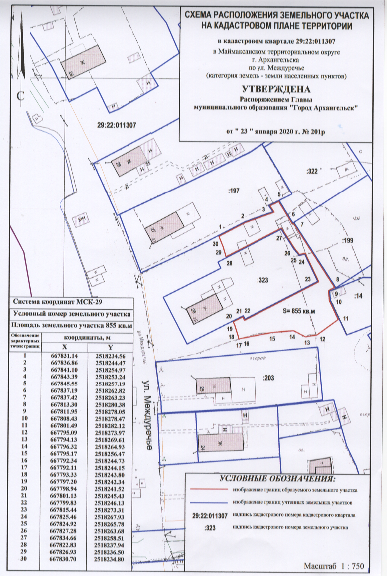 2. Утвердить прилагаемую схему расположения земельного участка в кадастровом квартале 29:22:011307 площадью 855 кв.м, расположенного в Маймаксанском территориальном округе г.Архангельска по улице Междуречье: