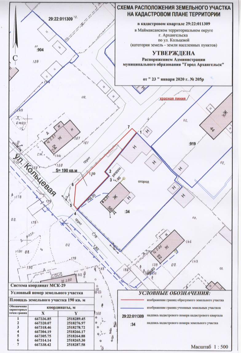 Распоряжение от 23 января 2020 г. № 205р "О предоставлении разрешения на условно разрешенный вид использования земельного участка, расположенного в Маймаксанском территориальном округе г.Архангельска по улице Кольцевой, об утверждении схемы расположения земельного участка"