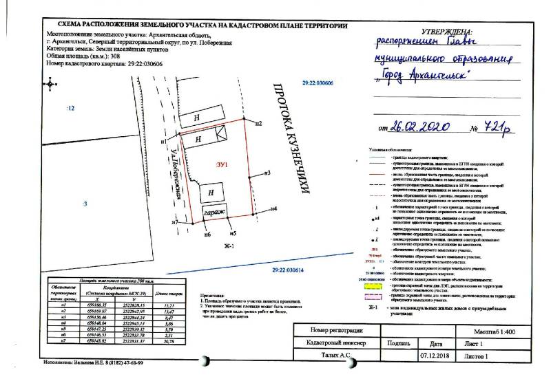 Распоряжение от 26 февраля 2020 г. № 721р "О предоставлении разрешения на условно разрешенный вид использования земельного участка, расположенного в Северном территориальном округе г. Архангельска по улице Побережной, об утверждении схемы расположения земельного участка"