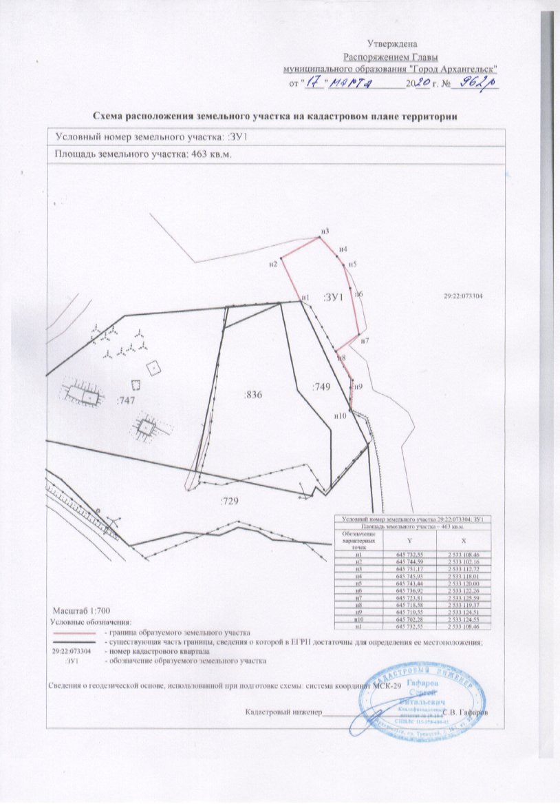 Распоряжение от 17 марта 2020 г. № 962р "О предоставлении разрешения на условно разрешенный вид использования земельного участка, расположенного в территориальном округе Варавино-Фактория г. Архангельска на территории КИЗ Силикат 1-я линия, об утверждении схемы расположения земельного участка"