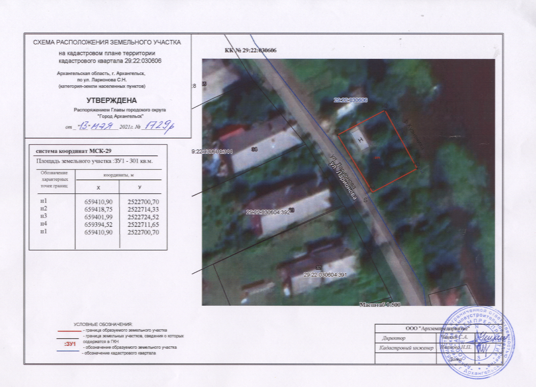 Распоряжение от 13 мая 2021 г. № 1729р "О предоставлении разрешения на условно разрешенный вид использования земельного участка, расположенного в Северном территориальном округе г. Архангельска по улице Ларионова С.Н., об утверждении схемы расположения земельного участка"