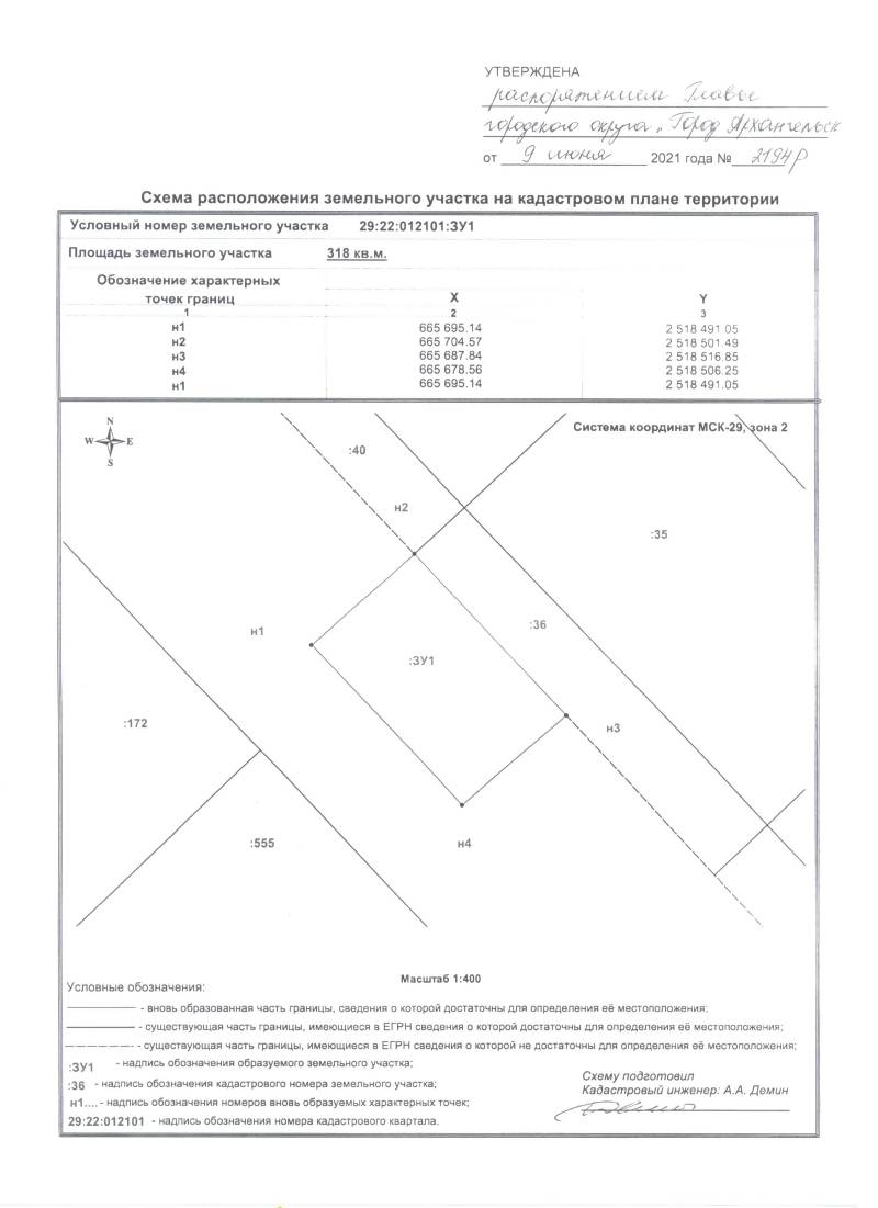 2. Утвердить прилагаемую схему расположения земельного участка площадью 318 кв.м в кадастровом квартале 29:22:012101 по улице Сибирской, 1-й проезд, в границах территориальной зоны индивидуальных жилых домов с приусадебными участками Ж-1 согласно Правилам землепользования и застройки муниципального образования "Город Архангельск" (категория земель – земли населенных пунктов) с видом разрешенного использования "ведение огородничества: размещение хозяйственных построек, не являющихся объектами недвижимости, предназначенных для хранения инвентаря и урожая сельскохозяйственных культур".