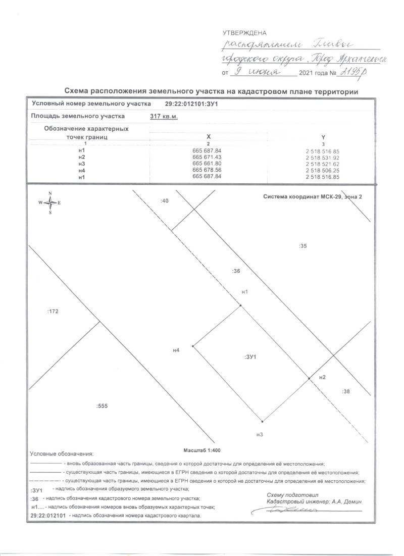 2. Утвердить прилагаемую схему расположения земельного участка площадью 317 кв.м в кадастровом квартале 29:22:012101 по улице Сибирской, 1-й проезд, в границах территориальной зоны индивидуальных жилых домов с приусадебными участками Ж-1 согласно Правилам землепользования и застройки муниципального образования "Город Архангельск" (категория земель – земли населенных пунктов) с видом разрешенного использования "ведение огородничества: размещение хозяйственных построек, не являющихся объектами недвижимости, предназначенных для хранения инвентаря и урожая сельскохозяйственных культур".