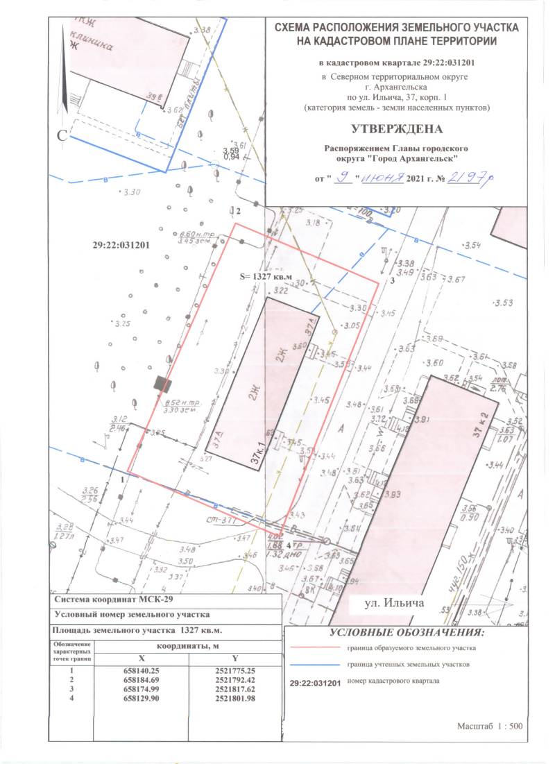 2. Утвердить прилагаемую схему расположения земельного участка в кадастровом квартале 29:22:031201 площадью 1 327 кв. м, расположенного в Северном территориальном округе г. Архангельска по улице Ильича, 37, корпус 1, в границах зоны застройки многоэтажными жилыми домами Ж4 согласно Правилам землепользования и застройки городского округа "Город Архангельск" (категория земель – земли населенных пунктов), с видом разрешенного использования "малоэтажная многоквартирная жилая застройка: размещение малоэтажных многоквартирных домов (многоквартирные дома высотой до 4 этажей, включая мансардный); обустройство спортивных и детских площадок, площадок для отдыха; размещение объектов обслуживания жилой застройки во встроенных, пристроенных и встроенно-пристроенных помещениях малоэтажного многоквартирного дома, если общая площадь таких помещений в малоэтажном многоквартирном доме не составляет более 15% общей площади помещений дома.