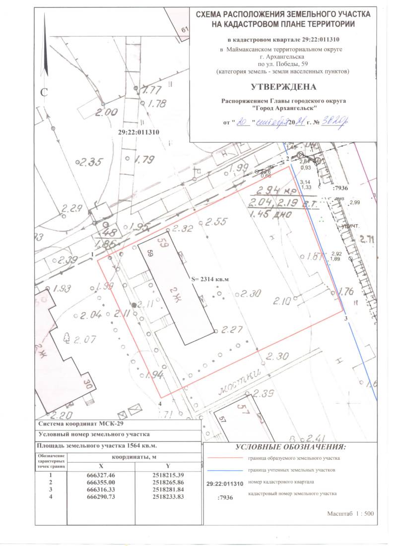 2. Утвердить прилагаемую схему расположения земельного участка площадью 1 564 кв. м в кадастровом квартале 29:22:011310, расположенного в Маймаксанском территориальном округе г. Архангельска по улицы Победы, д. 59, в границах зоны застройки среднеэтажными жилыми домами Ж3 согласно Правилам землепользования и застройки городского округа "Город Архангельск" (категория земель – земли населенных пунктов) с видом разрешенного использования "малоэтажная многоквартирная жилая застройка: размещение малоэтажных многоквартирных домов (многоквартирные дома высотой до 4 этажей, включая мансардный); обустройство спортивных и детских площадок, площадок для отдыха; размещение объектов обслуживания жилой застройки во встроенных, пристроенных и встроенно-пристроенных помещениях малоэтажного многоквартирного дома, если общая площадь таких помещений в малоэтажном многоквартирном доме не составляет более 15% общей площади помещений дома."