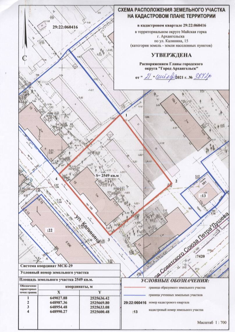 земельного участка в кадастровом квартале 29:22:060416 площадью 2 549 кв. м, расположенного в территориальном округе Майская горка г. Архангельска по улице Калинина, 15;