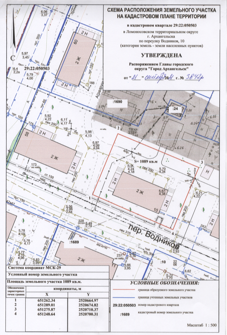 земельного участка в кадастровом квартале 29:22:050503 площадью 1 089 кв. м, расположенного в Ломоносовском территориальном округе г. Архангельска по переулку Водников, 10;