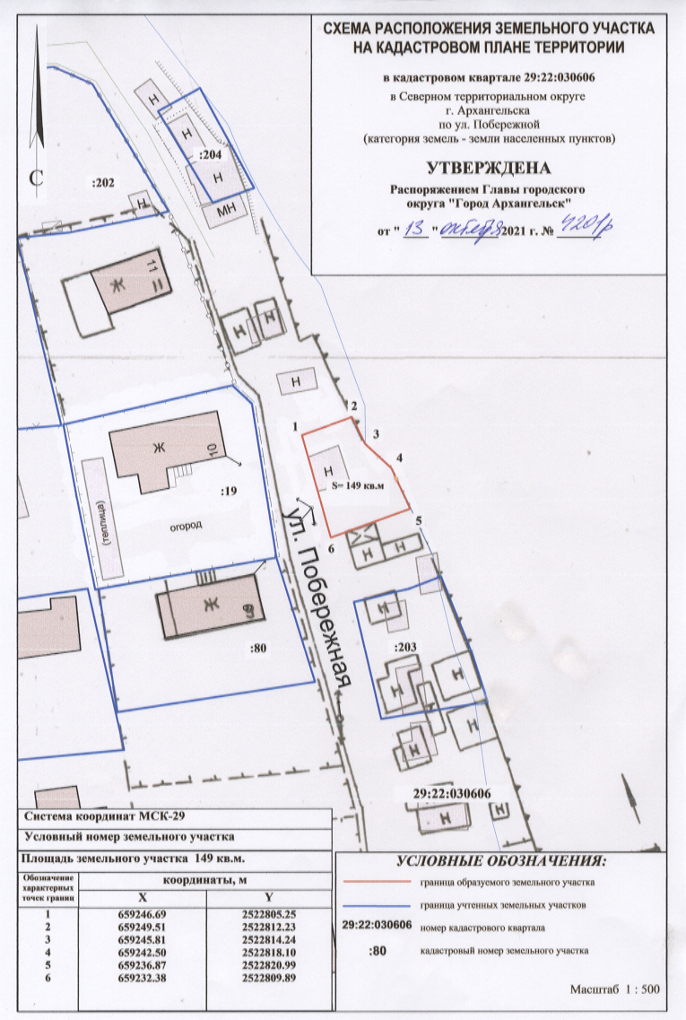 2. Утвердить прилагаемую схему расположения земельного участка площадью 149 кв. м, в кадастровом квартале 29:22:030606, расположенного в Северном территориальном округе г. Архангельска по улице Побережной, в границах территориальной зоне застройки индивидуальными жилыми домами Ж1 согласно Правилам землепользования и застройки городского округа "Город Архангельск" (категория земель-земли населенных пунктов) с видом разрешенного использования "Ведение огородничества: размещение хозяйственных построек, не являющихся объектами недвижимости, предназначенных для хранения инвентаря и урожая сельскохозяйственных культур"
