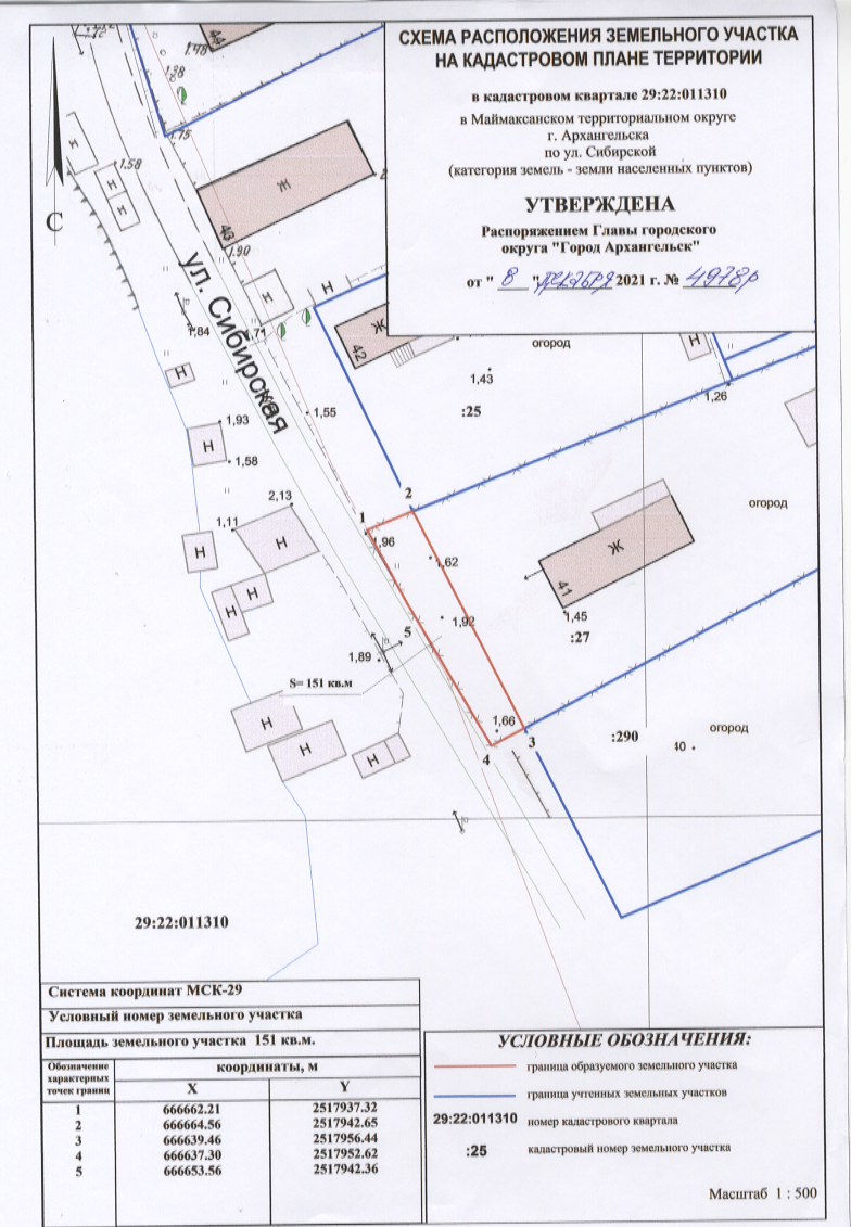 2. Утвердить прилагаемую схему расположения земельного участка площадью 151 кв. м, в кадастровом квартале 29:22:011310, расположенного в Маймаксанском территориальном округе г. Архангельска по улице Сибирской, в границах территориальной зоне застройки индивидуальными жилыми домами Ж1 согласно Правилам землепользования и застройки муниципального образования "Город Архангельск" (категория земель – земли населенных пунктов) с видом разрешенного использования "Ведение огородничества: размещение хозяйственных построек, не являющихся объектами недвижимости, предназначенных для хранения инвентаря и урожая сельскохозяйственных культур".