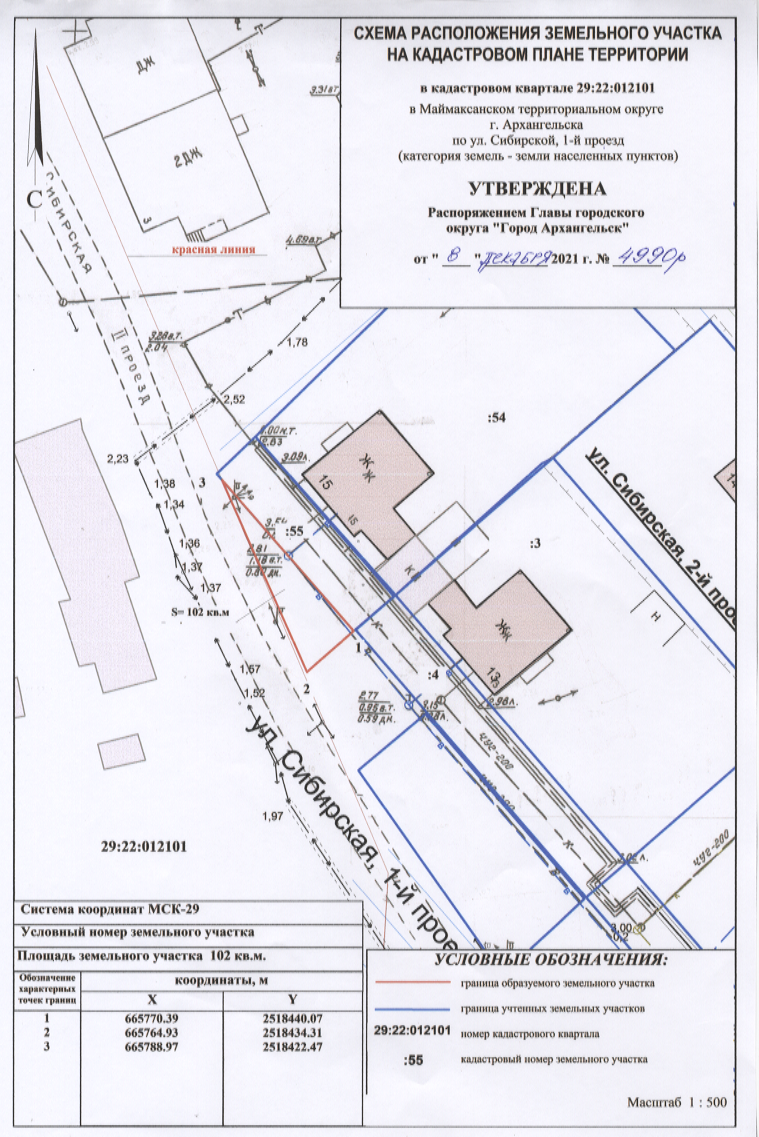 2. Утвердить прилагаемую схему расположения земельного участка площадью 102 кв. м, в кадастровом квартале 29:22:012101, расположенного в Маймаксанском территориальном округе г. Архангельска по улице Сибирской, 1-й проезд, в границах территориальной зоне застройки индивидуальными жилыми домами Ж1 согласно Правилам землепользования и застройки муниципального образования "Город Архангельск" (категория земель – земли населенных пунктов) с видом разрешенного использования "Ведение огородничества: размещение хозяйственных построек, не являющихся объектами недвижимости, предназначенных для хранения инвентаря и урожая сельскохозяйственных культур".