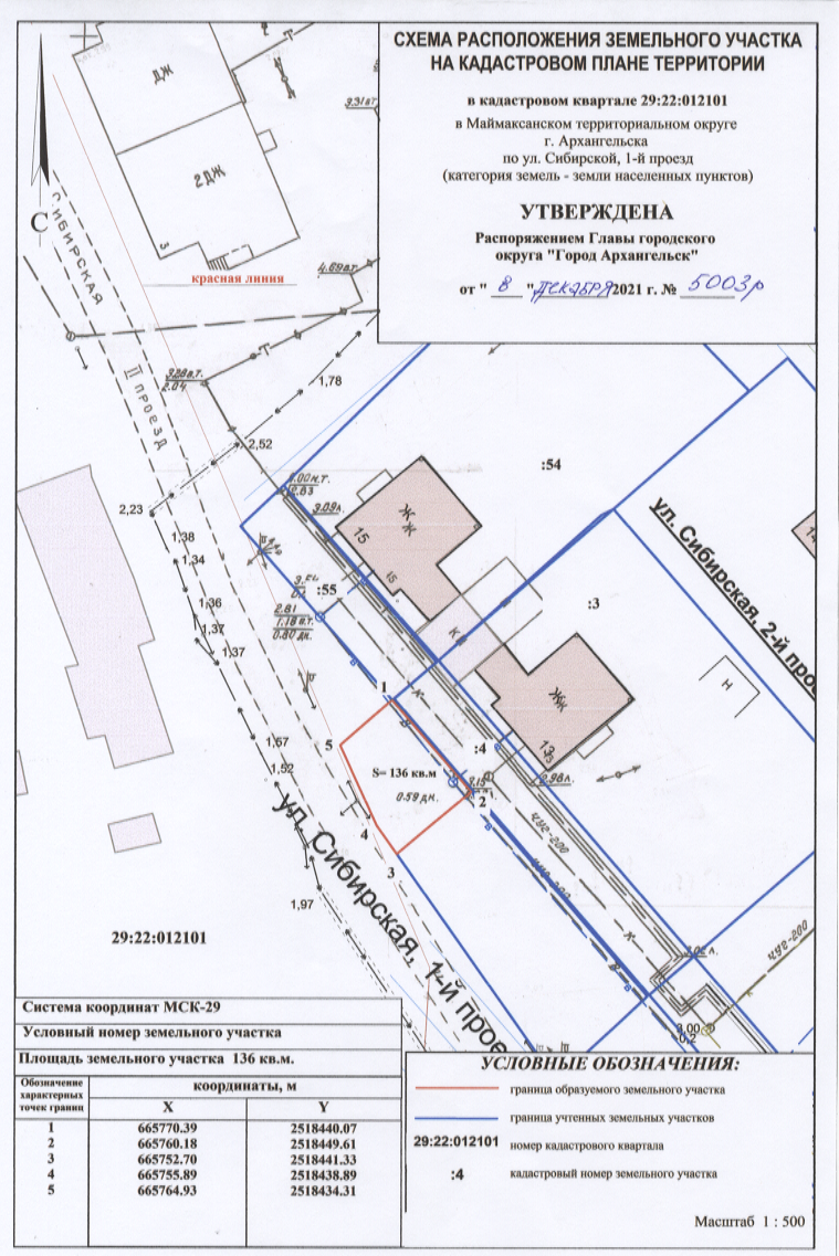 Распоряжение от 8 декабря 2021 г. № 5003р "О предоставлении разрешения на условно разрешенный вид использования земельного участка, расположенного в Маймаксанском территориальном округе г. Архангельска по улице Сибирской, 1-й проезд, об утверждении схемы расположения земельного участка"