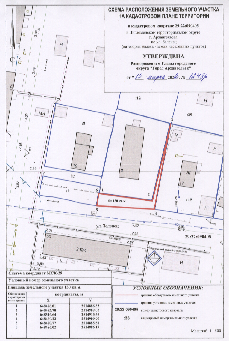2. Утвердить прилагаемую схему расположения земельного участка площадью 130 кв. м в кадастровом квартале 29:22:090405, расположенного в Цигломенском территориальном округе г. Архангельска по ул. Зеленец, в границах территориальной зоны застройки малоэтажными жилыми домами Ж2 согласно Правилам землепользования и застройки городского округа "Город Архангельск" (категория земель – земли населенных пунктов) с видом разрешенного использования "ведение огородничества: осуществление отдыха и (или) выращивания гражданами для собственных нужд сельскохозяйственных культур; размещение хозяйственных построек, не являющихся объектами недвижимости, предназначенных для хранения инвентаря и урожая сельскохозяйственных культур".