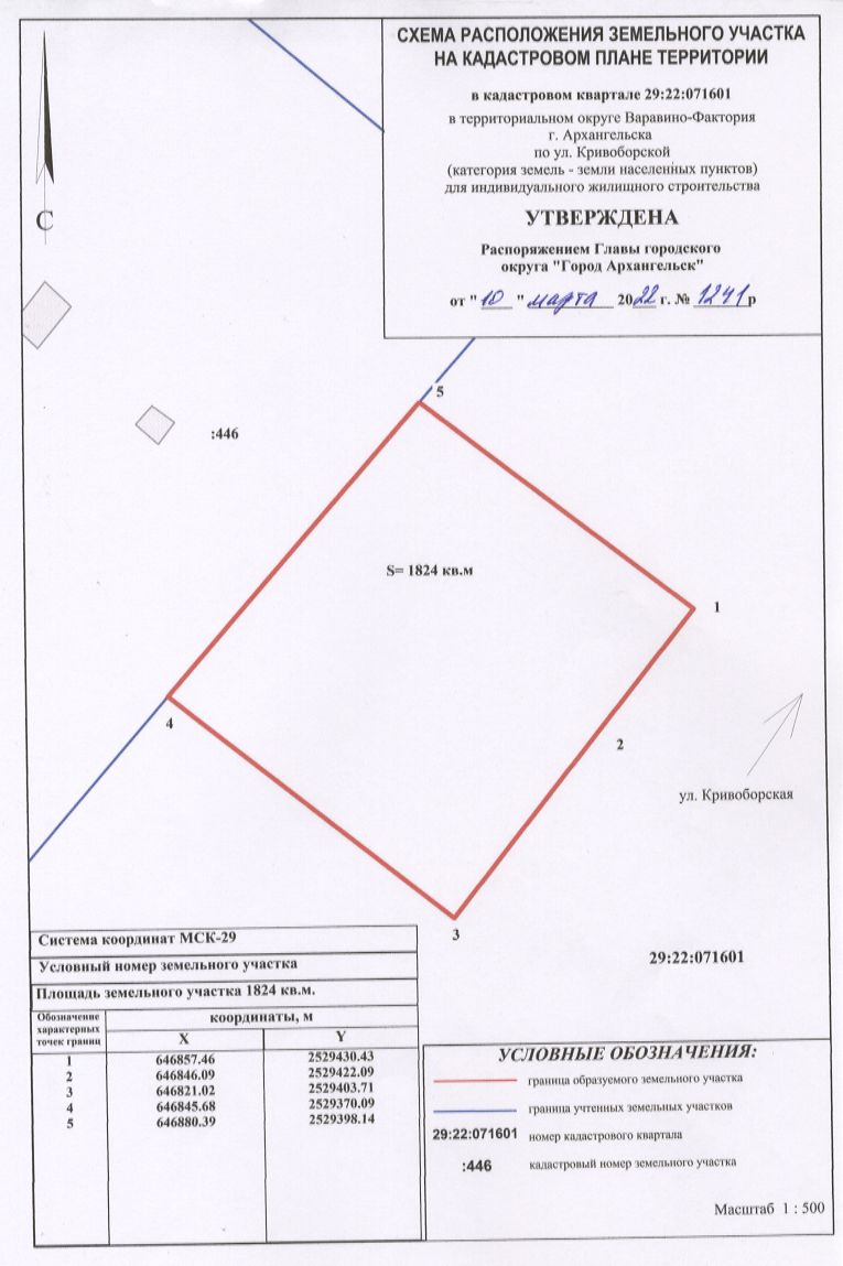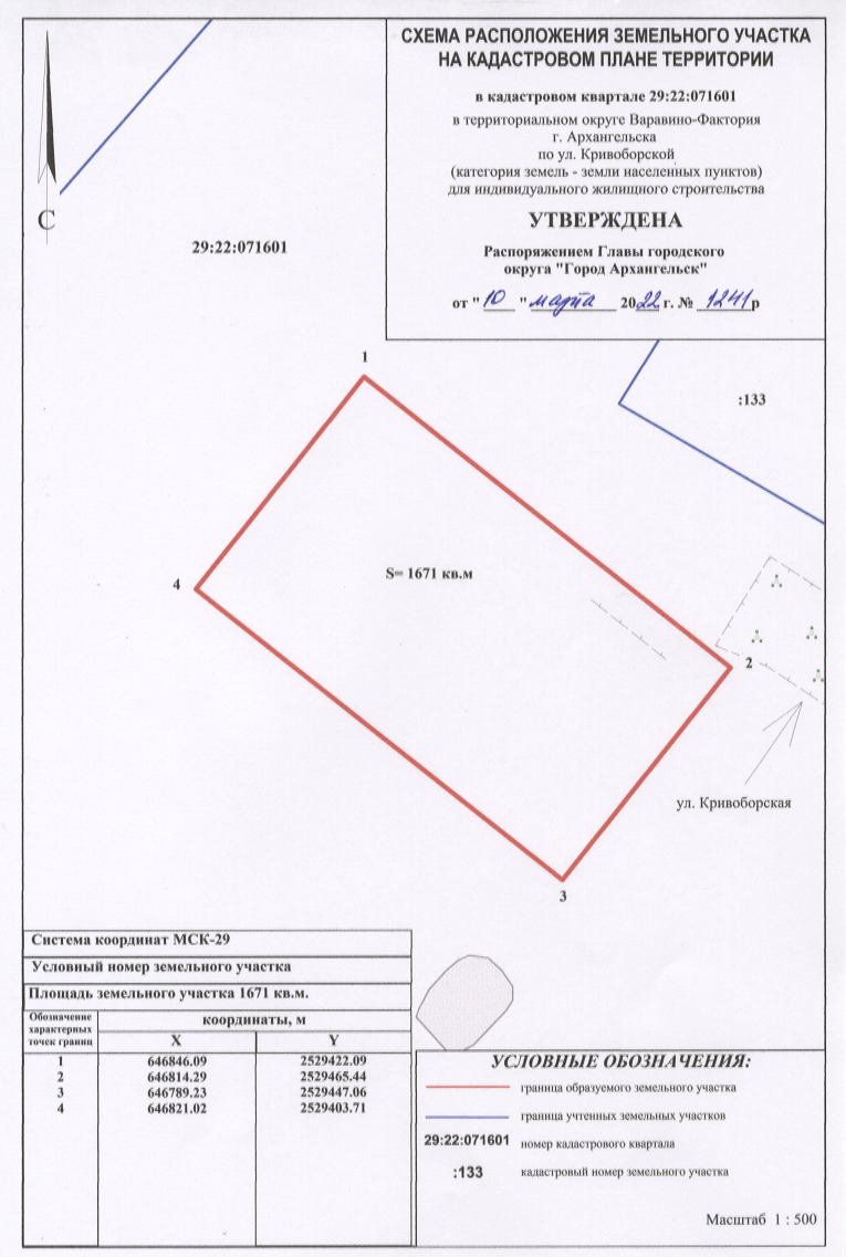 Распоряжение от 10 марта 2022 г. № 1241р "О предоставлении разрешения на условно разрешенный вид использования земельных участков, расположенных в территориальном округе Варавино-Фактория г. Архангельска по улице Кривоборской, об утверждении схем расположения земельных участков"
