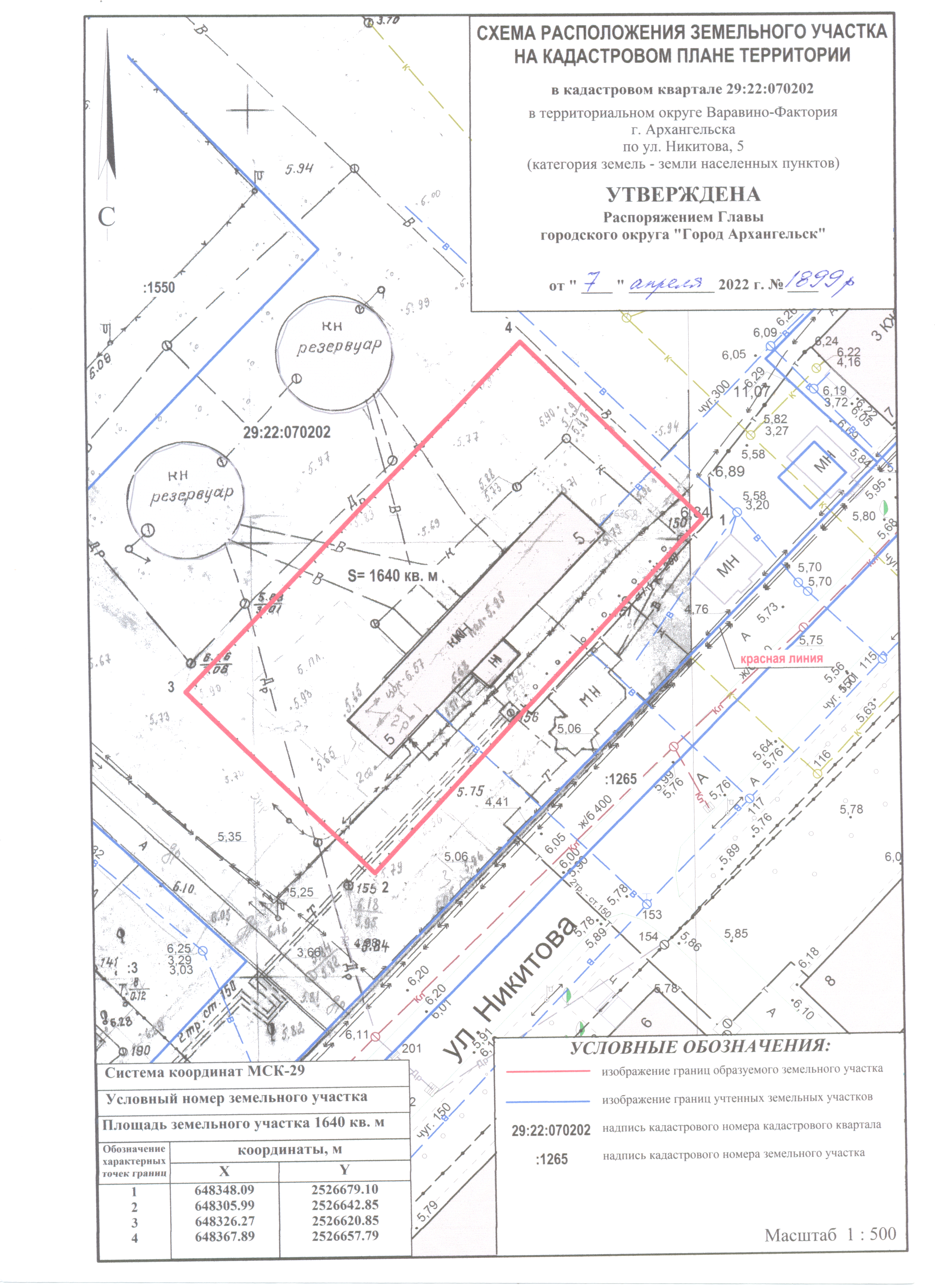 2. Утвердить прилагаемую схему расположения земельного участка площадью 1 640 кв. м, в кадастровом квартале 29:22:070202, расположенного в территориальном округе Варавино-Фактория г. Архангельска по улице Никитова, в границах многофункциональной общественно-деловой территориальной зоны О1 согласно Правилам землепользования и застройки муниципального образования "Город Архангельск" (категория земель – земли населенных пунктов), с видом разрешенного использования "Коммунальное обслуживание".