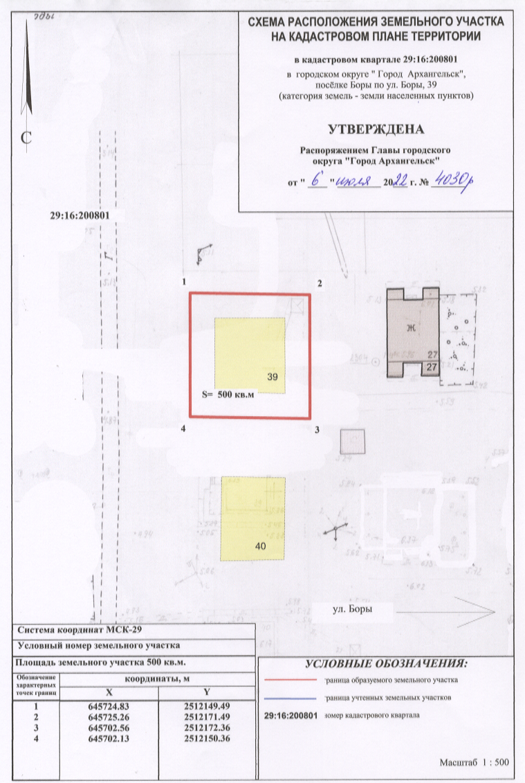 земельного участка в кадастровом квартале 29:16:200801 площадью 500 кв. м, расположенного в городском округе "Город Архангельск", посёлке Боры по ул. Боры, 39;