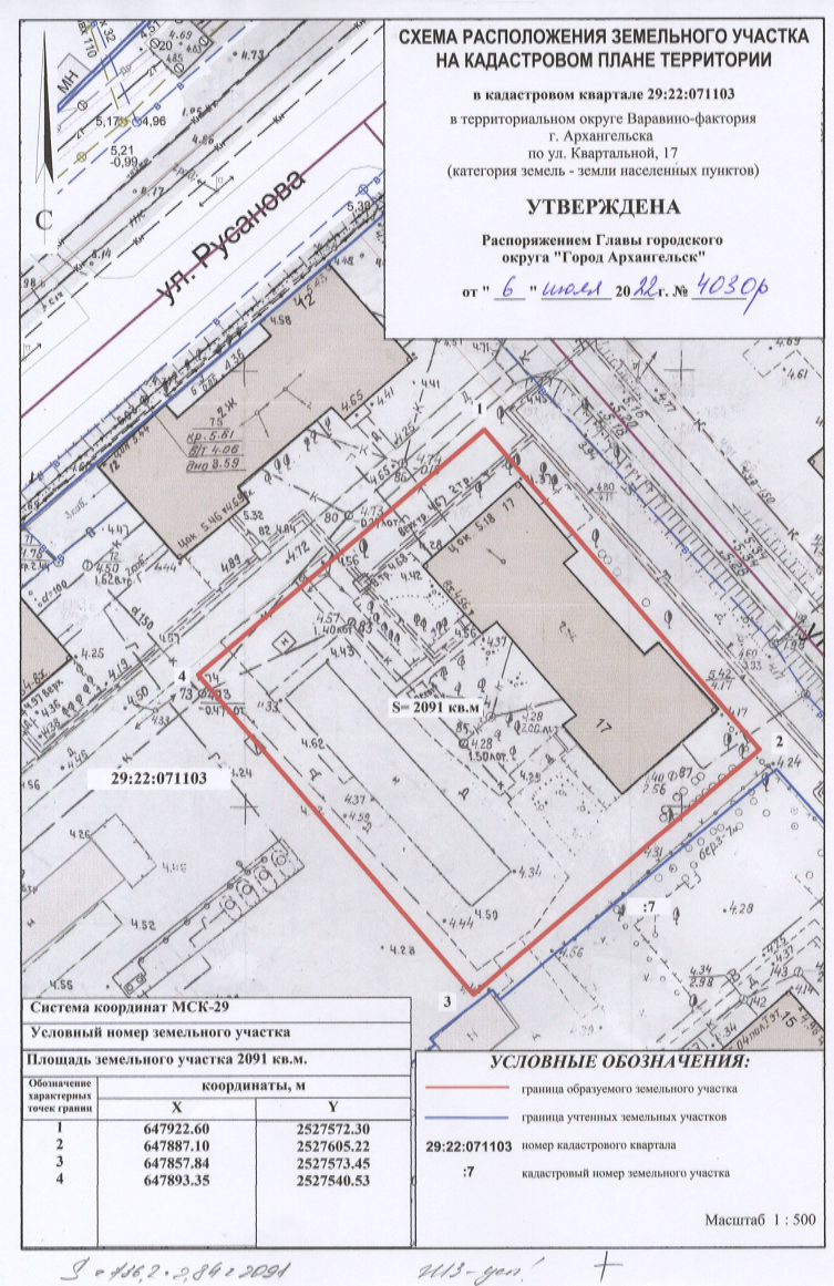 земельного участка в кадастровом квартале 29:22:071103 площадью 2 091 кв. м, расположенного в территориальном округе Варавино-Фактория г. Архангельска по улице Квартальной, 17;