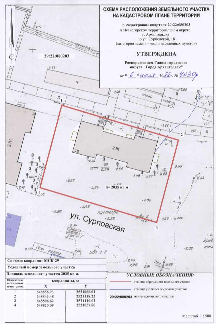 земельного участка в кадастровом квартале 29:22:080203 площадью 2 035 кв. м, расположенного в Исакогорском территориальном округе