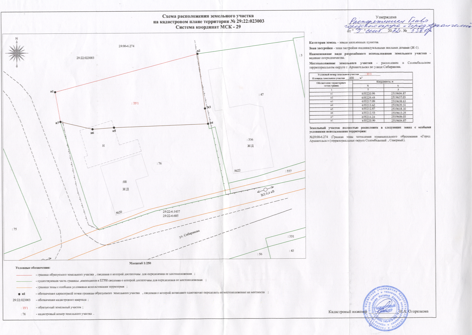2.Утвердить прилагаемую схему расположения земельного участка площадью 400 кв. м в кадастровом квартале 29:22:023003, расположенного в Соломбальском территориальном округе г. Архангельска по ул. Сибирякова, в границах территориальной зоны застройки индивидуальными жилыми домами Ж1 согласно Правилам землепользования и застройки городского округа "Город Архангельск" (категория земель – земли населенных пунктов) с видом разрешенного использования "ведение огородничества: размещение хозяйственных построек, не являющихся объектами недвижимости, предназначенных для хранения инвентаря и урожая сельскохозяйственных культур".