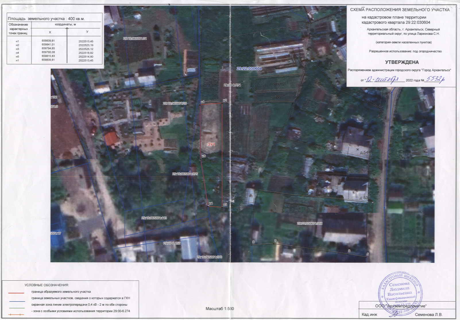 2. Утвердить прилагаемую схему расположения земельного участка площадью 400 кв. м в кадастровом квартале 29:22:030604, расположенного в Северном территориальном округе г. Архангельска по ул. Ларионова С.Н., в границах территориальной зоны застройки индивидуальными жилыми домами Ж1 согласно Правилам землепользования и застройки городского округа "Город Архангельск" (категория земель – земли населенных пунктов) с видом разрешенного использования "ведение огородничества: размещение хозяйственных построек, не являющихся объектами недвижимости, предназначенных для хранения инвентаря и урожая сельскохозяйственных культур".