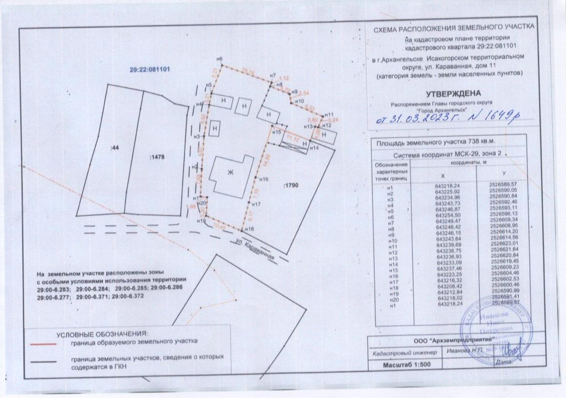 2. Утвердить прилагаемую схему расположения земельного участка площадью 738 кв. м в кадастровом квартале 29:22:081101, расположенного в Исакогорском территориальном округе г. Архангельска по ул. Караванной в границах территориальной зоны застройки малоэтажными жилыми домами Ж2 согласно Правилам землепользования и застройки городского округа "Город Архангельск" (категория земель – земли населенных пунктов) с видом разрешенного использования "ведение огородничества: размещение хозяйственных построек, не являющихся объектами недвижимости, предназначенных для хранения инвентаря и урожая сельскохозяйственных культур".