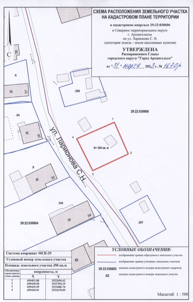 2. Утвердить прилагаемую схему расположения земельного участка площадью 350 кв. м в кадастровом квартале 29:22:030606, расположенного в Северном территориальном округе г. Архангельска по ул. Ларионова С.Н., в границах территориальной зоны застройки индивидуальными жилыми домами Ж1 согласно Правилам землепользования и застройки городского округа "Город Архангельск" (категория земель – земли населенных пунктов) с видом разрешенного использования "Ведение огородничества: размещение хозяйственных построек, не являющихся объектами недвижимости, предназначенных для хранения инвентаря и урожая сельскохозяйственных культур".
