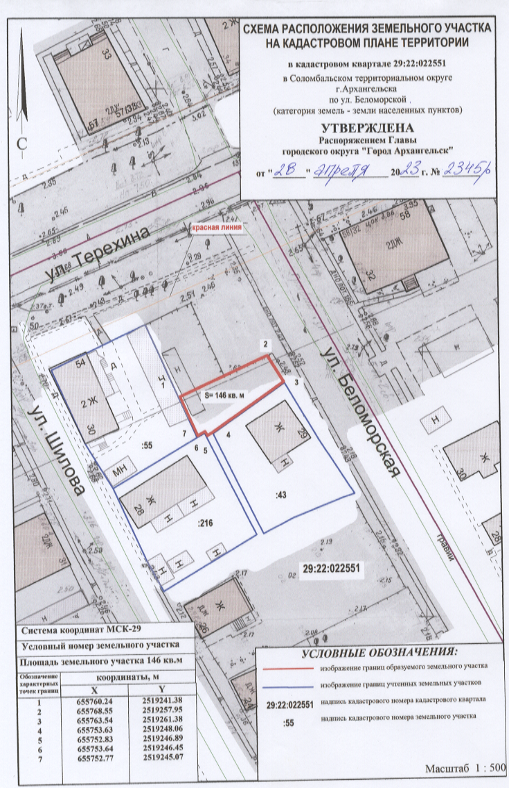 2.     Утвердить прилагаемую схему расположения земельного участка площадью 146 кв. м в кадастровом квартале 29:22:022551, расположенного в Соломбальском территориальном округе г. Архангельска по ул. Беломорской, в границах территориальной зоны застройки индивидуальными жилыми домами Ж1 согласно Правилам землепользования и застройки городского округа "Город Архангельск" (категория земель – земли населенных пунктов) с видом разрешенного использования "Ведение огородничества: Осуществление отдыха и (или) выращивания гражданами для собственных нужд сельскохозяйственных культур; размещение хозяйственных построек, не являющихся объектами недвижимости, предназначенных для хранения инвентаря и урожая сельскохозяйственных культур".