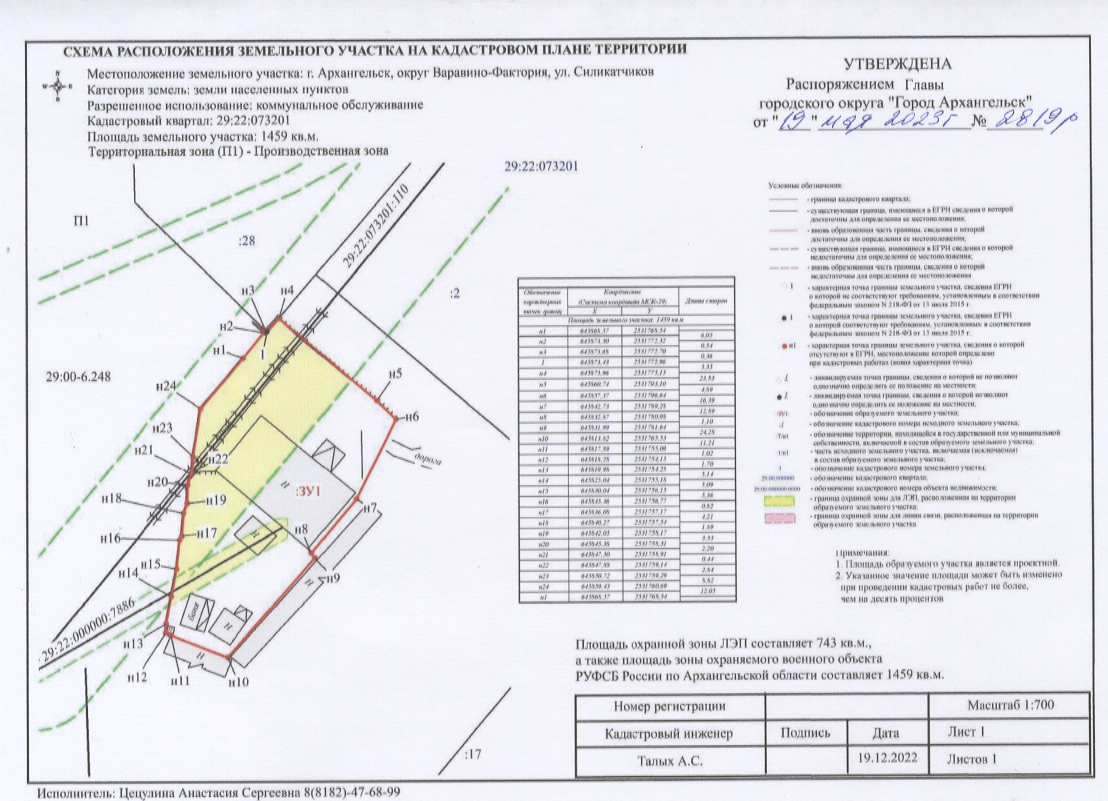 2.Утвердить прилагаемую схему расположения земельного участка площадью 1 459 кв. м, в кадастровом квартале 29:22:073201, расположенного в территориальном округе Варавино-Фактория г.Архангельска по улице Силикатчиков, 15, корпус 1 в границах производственной территориальной зоны П1 согласно Правилам землепользования и застройки городского округа "Город Архангельск" (категория земель – земли населенных пунктов) с видом разрешенного использования "Коммунальное обслуживание".