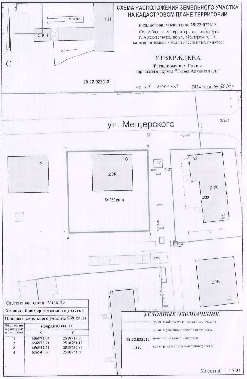 2. Адрес месторасположения земельного участка: г. Архангельск, ул. Мещерского, д. 10. Данный земельный участок расположен в кадастровом квартале 29:22:022513. Утвержденная схема расположения земельного участка: