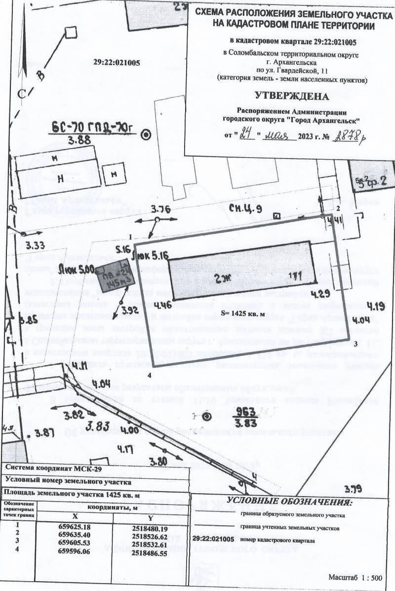 2. Адрес месторасположения земельного участка: г. Архангельск, ул. Гвардейская, д. 11. Данный земельный участок расположен в кадастровом квартале 29:22:021005. Утвержденная схема расположения земельного участка: