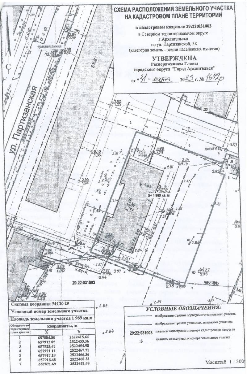 2. Адрес месторасположения земельного участка: г. Архангельск, ул. Партизанская, д. 38. Данный земельный участок расположен в кадастровом квартале 29:22:031003. Утвержденная схема расположения земельного участка: