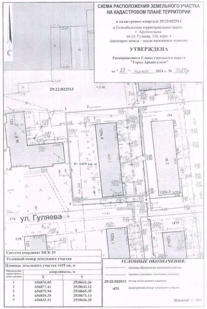 2. Адрес месторасположения земельного участка: г. Архангельск, ул. Гуляева, д. 120, корп. 4. Данный земельный участок расположен в кадастровом квартале 29:22:022513. Утвержденная схема расположения земельного участка: