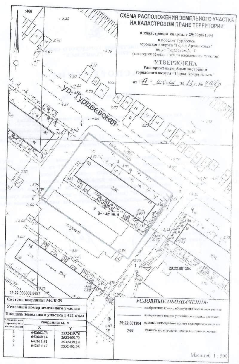2. Адрес месторасположения земельного участка: г. Архангельск, ул. Турдеевская, д. 10. Данный земельный участок расположен в кадастровом квартале 29:22:081304. Утвержденная схема расположения земельного участка: