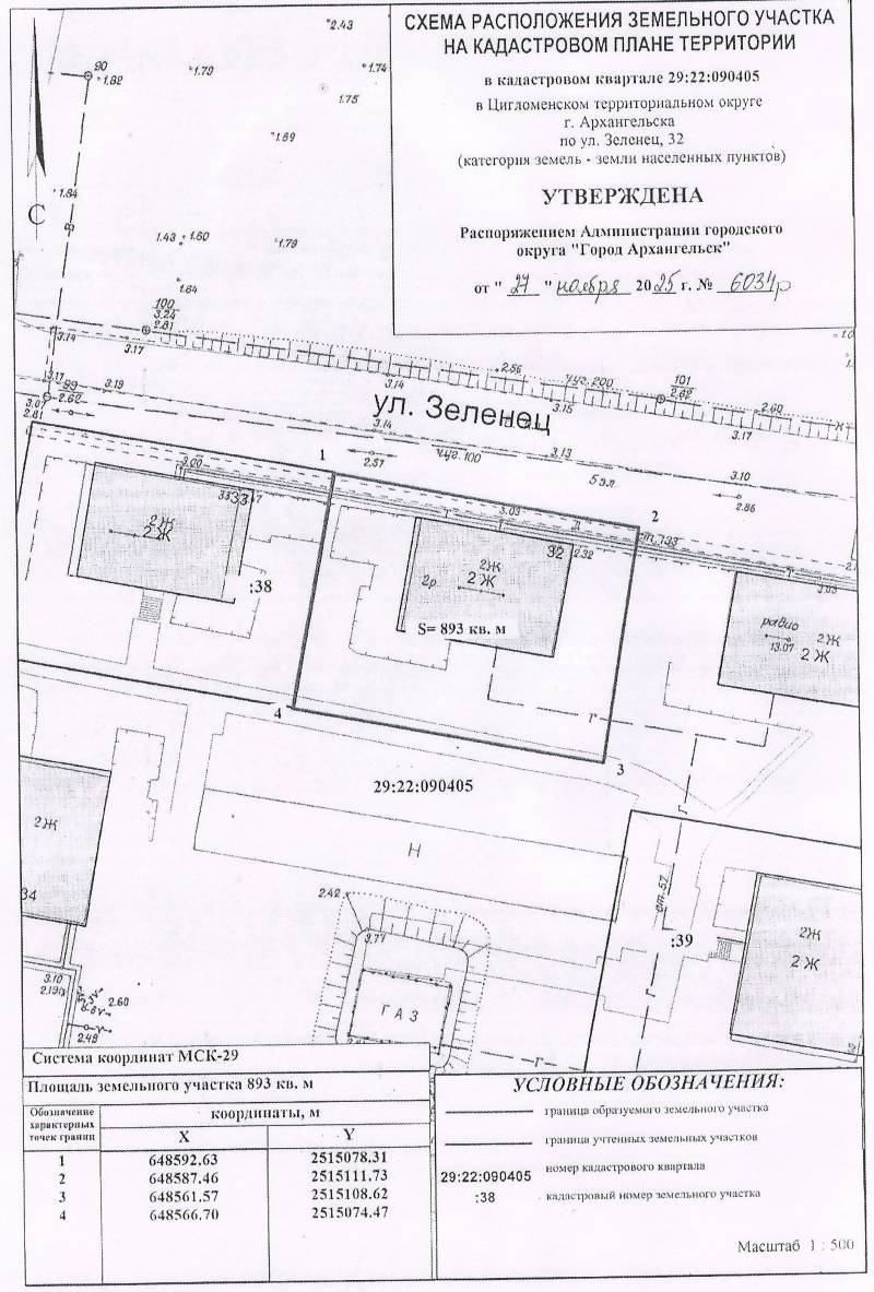 2. Адрес месторасположения земельного участка: г. Архангельск, ул. Зеленец, д. 32. Данный земельный участок расположен в кадастровом квартале 29:22:090405. Утвержденная схема расположения земельного участка: