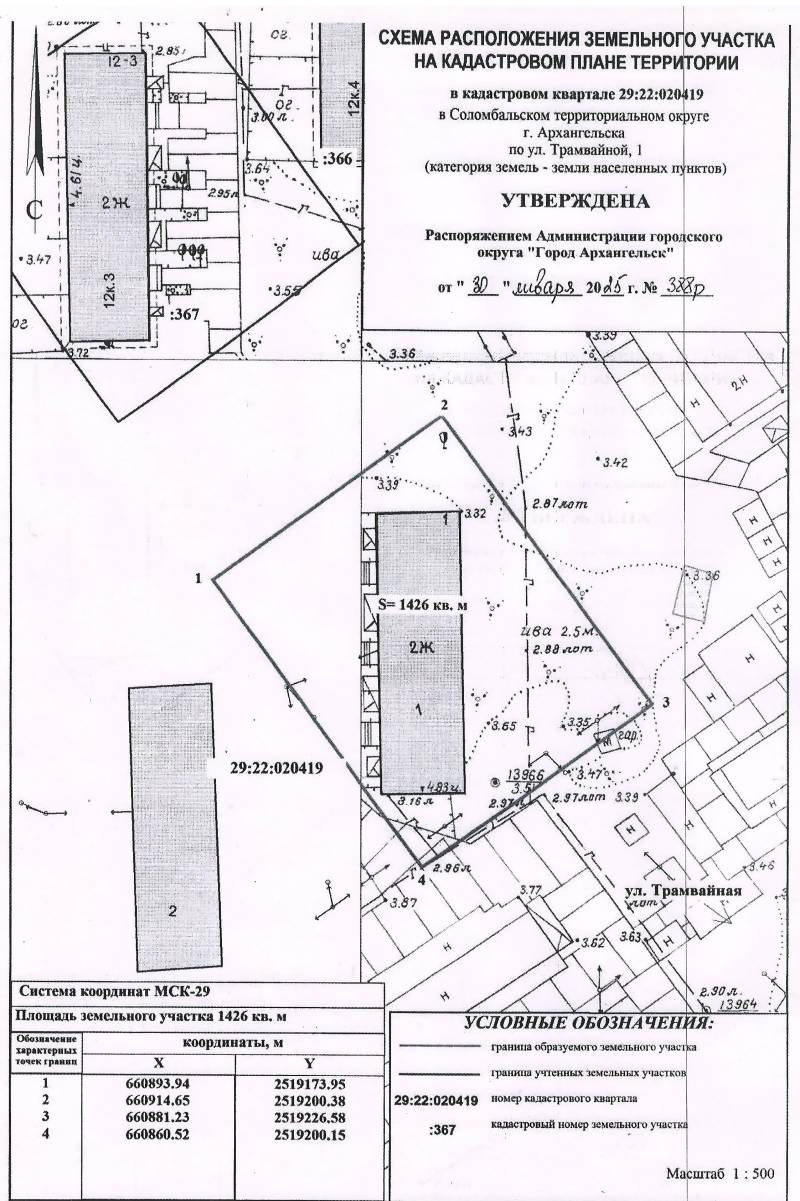 2. Адрес месторасположения земельного участка: г. Архангельск, ул. Трамвайная, д. 1. Данный земельный участок расположен в кадастровом квартале 29:22:020419. Утвержденная схема расположения земельного участка: