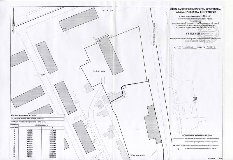2. Адрес месторасположения земельного участка: г. Архангельск, ул. Адмирала Кузнецова, д. 3 / ул. Маяковского, д. 60, корп. 1. Данный земельный участок расположен в кадастровом квартале 29:22:022539. Утвержденная схема расположения земельного участка: