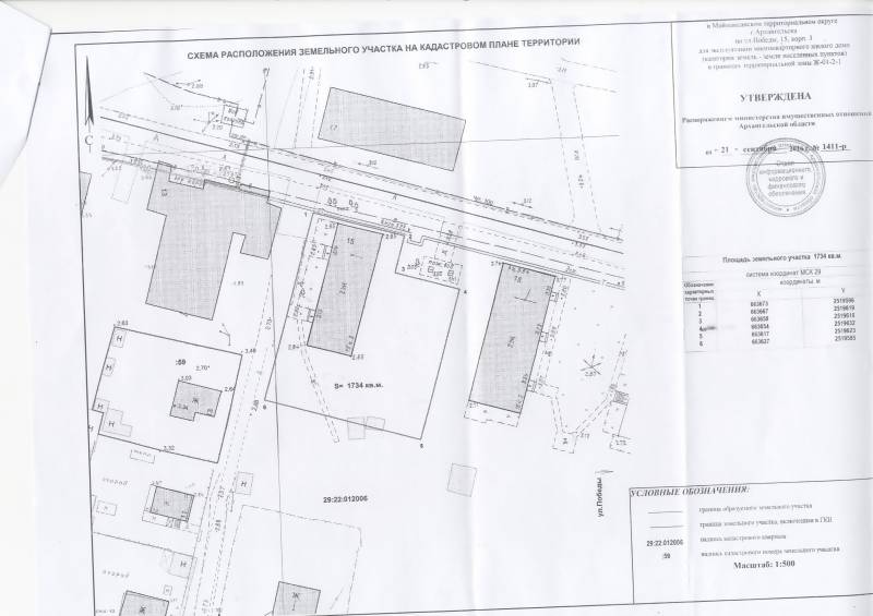 2. Адрес месторасположения земельного участка: г. Архангельск, ул. Победы, д. 15, корп. 3. Данный земельный участок расположен в кадастровом квартале 29:22:012006. Утвержденная схема расположения земельного участка: