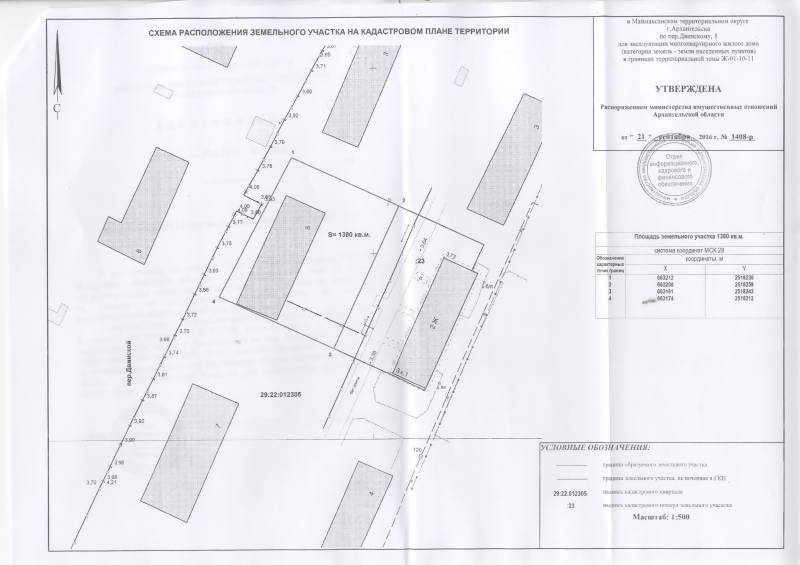 2. Адрес месторасположения земельного участка: г. Архангельск, пер. Двинской, д. 5. Данный земельный участок расположен в кадастровом квартале 29:22:012305. Утвержденная схема расположения земельного участка: