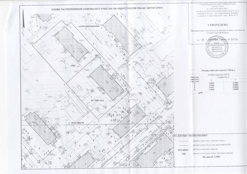 2. Адрес месторасположения земельного участка: г. Архангельск ул. Республиканская, д. 8. Данный земельный участок расположен в кадастровом квартале 29:22:060416. Утвержденная схема расположения земельного участка: