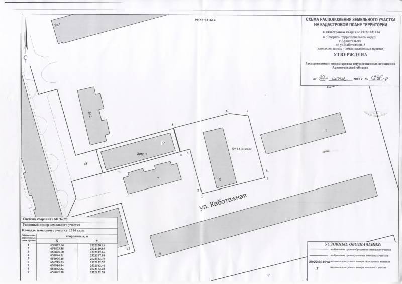 2. Адрес месторасположения земельного участка: г. Архангельск, ул. Каботажная, д. 5. Данный земельный участок расположен в кадастровом квартале 29:22:031614. Утвержденная схема расположения земельного участка: