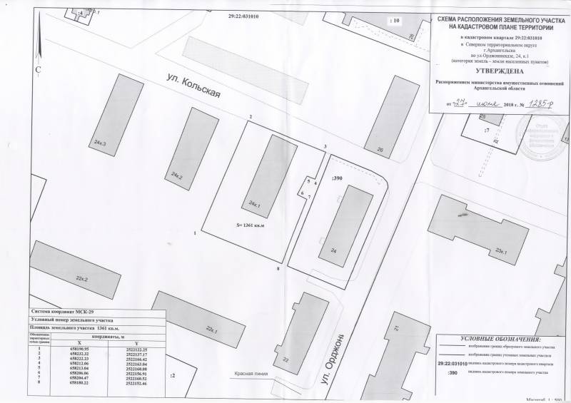 2. Адрес месторасположения земельного участка: г. Архангельск, ул. Орджоникидзе, д. 24, корп. 1. Данный земельный участок расположен в кадастровом квартале 29:22:031010. Утвержденная схема расположения земельного участка: