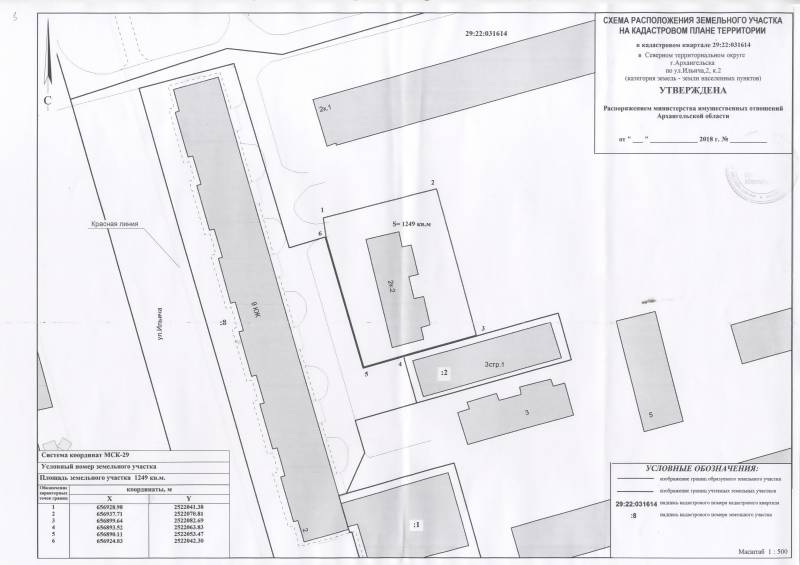 2. Адрес месторасположения земельного участка: г. Архангельск, ул. Ильича, д. 2, корп. 2. Данный земельный участок расположен в кадастровом квартале 29:22:031614. Утвержденная схема расположения земельного участка: