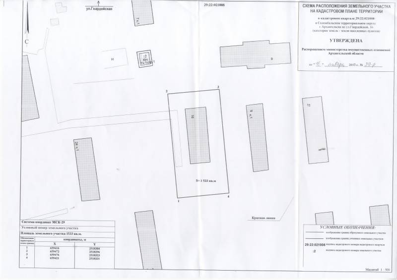 2. Адрес месторасположения земельного участка: г. Архангельск, ул. Гвардейская, д. 16. Данный земельный участок расположен в кадастровом квартале 29:22:021008. Утвержденная схема расположения земельного участка: