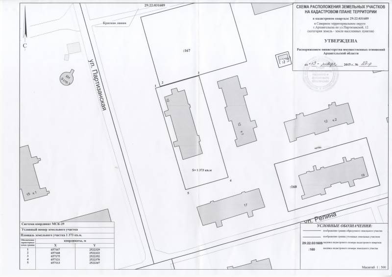 2. Адрес месторасположения земельного участка: г. Архангельск, ул. Партизанская, д. 12. Данный земельный участок расположен в кадастровом квартале 29:22:031609. Утвержденная схема расположения земельного участка: