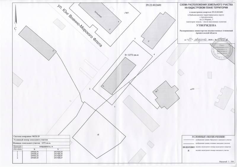 2. Адрес месторасположения земельного участка: г. Архангельск, ул. Моряка, д. 5. Данный земельный участок расположен в кадастровом квартале 29:22:012601. Утвержденная схема расположения земельного участка: