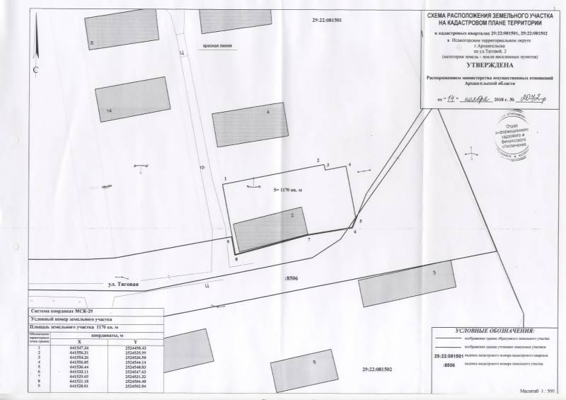 2. Адрес месторасположения земельного участка: г. Архангельск, ул. Тяговая, д. 2. Данный земельный участок расположен в кадастровых кварталах 29:22:081501, 29:22:081502. Утвержденная схема расположения земельного участка: