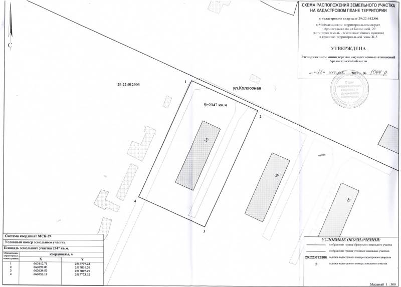2. Адрес месторасположения земельного участка: г. Архангельск, ул. Колхозная, д. 20. Данный земельный участок расположен в кадастровом квартале 29:22:012306. Утвержденная схема расположения земельного участка: