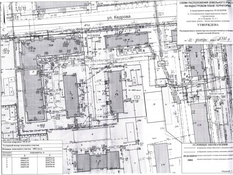 2. Адрес месторасположения земельного участка: г. Архангельск, ул. Кедрова, д. 22, корп. 1. Данный земельный участок расположен в кадастровом квартале 29:22:022518. Утвержденная схема расположения земельного участка: