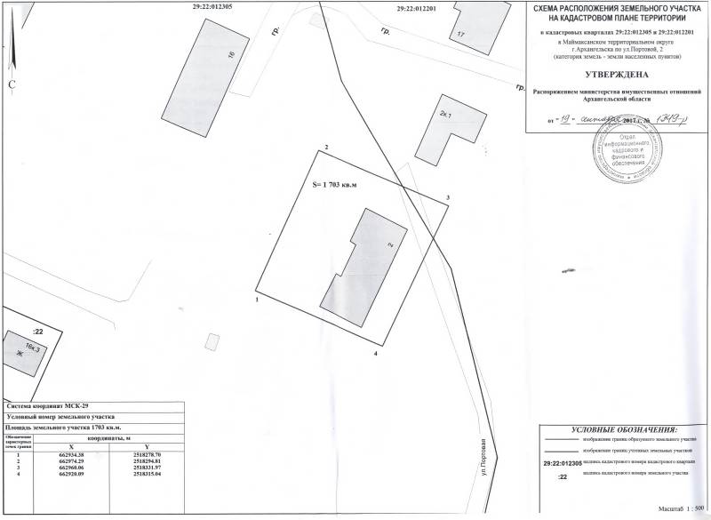 2. Адрес месторасположения земельного участка: г. Архангельск, ул. Портовая, д. 2. Данный земельный участок расположен в кадастровых кварталах 29:22:012305, 29:22:012201. Утвержденная схема расположения земельного участка: