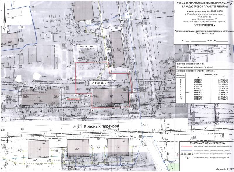 2. Адрес месторасположения земельного участка: г. Архангельск, ул. Красных партизан, д. 35. Данный земельный участок расположен в кадастровом квартале 29:22:022519. Утвержденная схема расположения земельного участка: